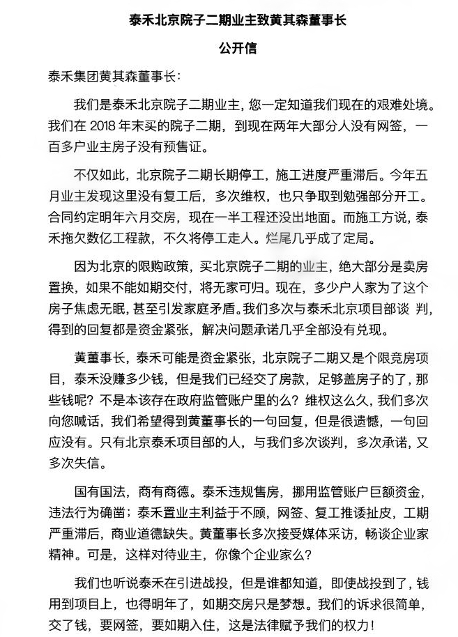此前就有微博爆料,泰禾的北京院子二期项目暴雷,业主发表公开信直指董事长黄其森,公开信中称,业主2018年购买北京院子二期,至今大部分人没有网签,一百多户业主房子没有预售证。另外,泰禾北京院子二期长期停工,施工进度严重滞后。经业主多次维权后才勉强部分开工。施工方表示泰禾拖欠数以工程款,不久将停工走人。项目烂尾几成定局。