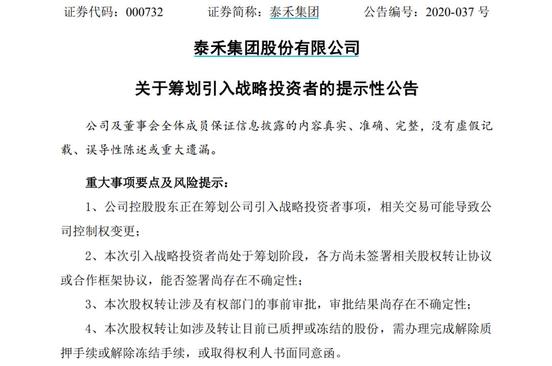 对此,泰禾集团早在5月14日就发布相关公告并提示风险称,公司控股股东正在筹划公司引入战略投资者事项,相关交易可能导致公司控制权变更;另外,本次引入战略投资者尚处于筹划阶段,各方尚未签署相关股权转让协议或合作框架协议,能否签署尚存在不确定性。昨天,泰禾在公告中再次作出相关表示。
