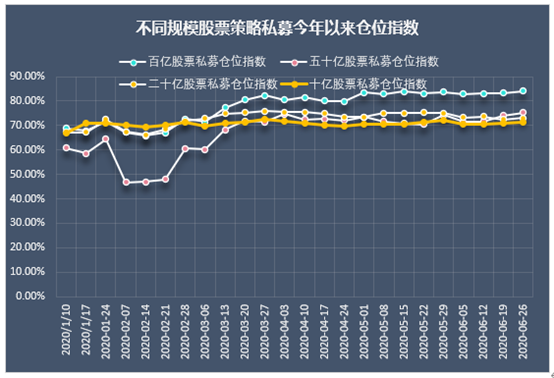 私募排排网组合大师数据显示,近一月股票私募仓位整体处于上升态势,截止6月26日,股票私募仓位指数为72.96%,较月初上升了0.8个百分点,环比上周加仓了0.84个百分点,其中49.96%的股票私募仓位超过八成。分规模来看,月初以来,百亿私募加仓了1.29个百分点,最新仓位指数为84.15%,74.48%的百亿私募仓位超过八成。