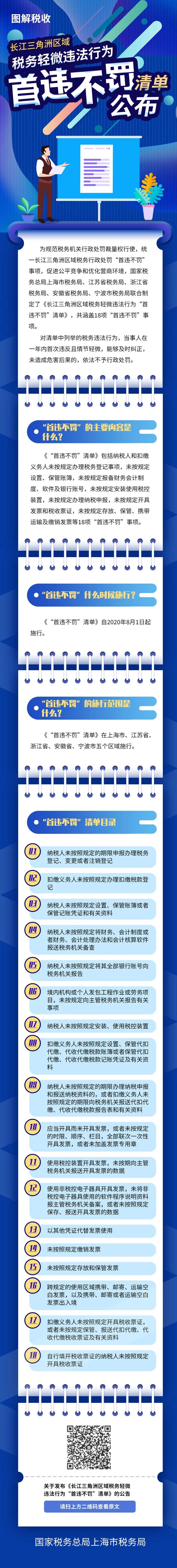 为更大力度推进税收征管一体化和办税便利化,更好发挥税收助力长三角一体化高质量发展的作用,国家税务总局去年11月出台了《关于支持和服务长江三角洲区域一体化发展措施的通知》,推出16项征管服务措施,制定长三角区域“首违不罚”清单位列其中。