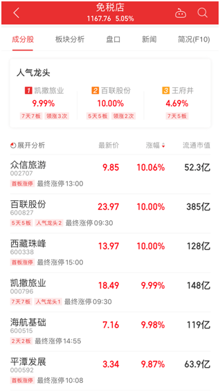 此外,相关免税店概念股今天继续集体发力,百联股份、凯撒旅业、众信旅游、海航基础等纷纷涨停。