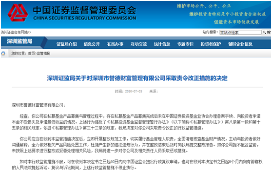 7月,深圳证监局也对深圳市誉德财富管理有限公司及其总经理卢成旺开出罚单,出具警示函,采取责令改正措施。主要问题是,该私募在私募基金产品募集与管理过程中,存在私募基金产品募集完成后未在基金业协会办理备案手续、向投资者承诺本金不受损失及承诺最低收益的情况,违反了《私募管理办法》第八条第一款和第十五条的相关规定。