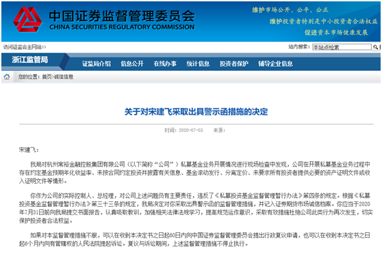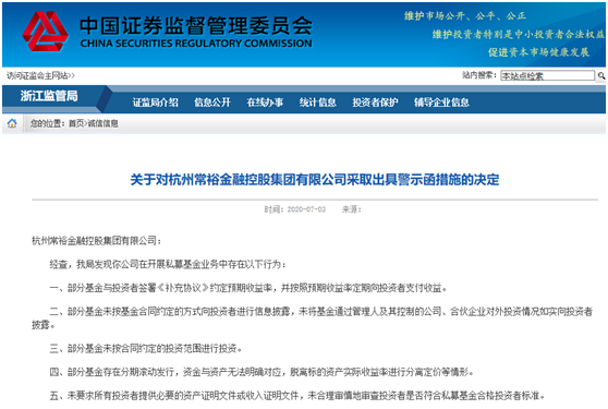 7月3日,浙江证监局对杭州常裕金融控股集团有限公司及其实控人、总经理宋建飞开出罚单,出具警示函。主要违法违规行为有五项: