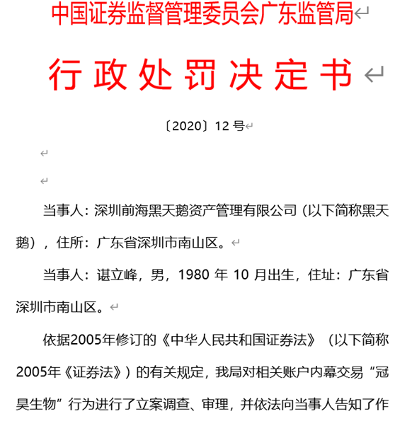 另外,广东证监局在7月1日开出的一份行政处罚决定书也值得注意,针对的是深圳前海黑天鹅资产管理有限公司及其高管谌立峰,内幕交易“冠昊生物”的事件。