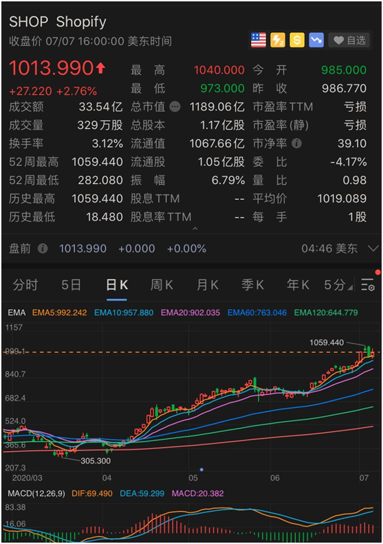 其中,Shopify是一家加拿大电子商务软件开发商,为电商卖家提供搭建网店的技术和模版。受益于疫情间人们纷纷转向网购的趋势。截至美东时间7月7日收盘,该股票今年以来上涨155%。