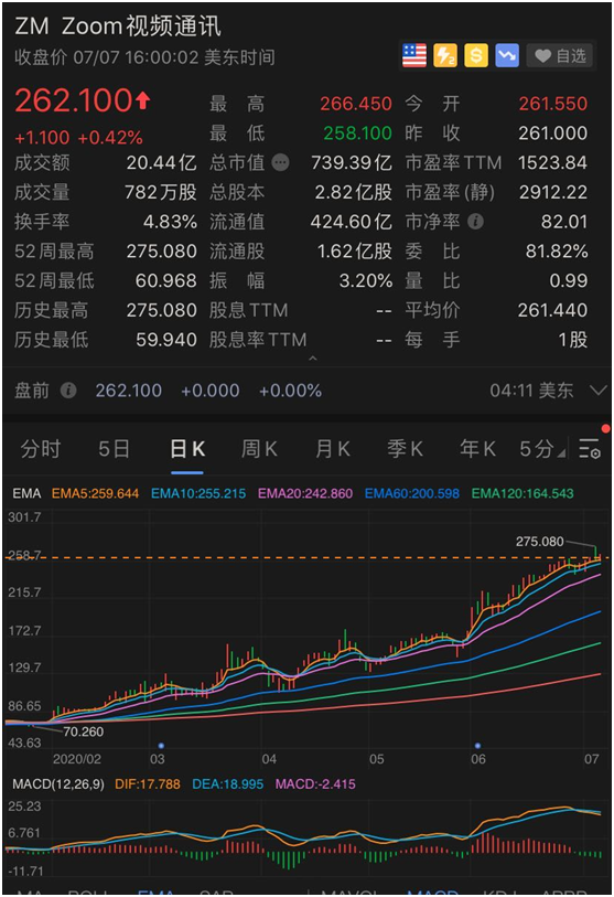在该冠军基金的前三大重仓股中,表现最为亮眼的是视频会议公司Zoom。截至美东时间7月7日收盘,今年以来该公司上涨285%。