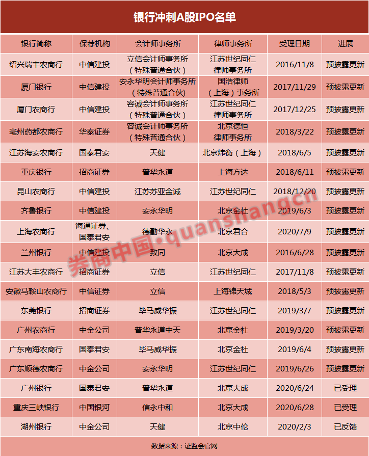 据证监会最新披露情况,当前,A股共有19家银行在排队IPO,其中16家已经是“预先披露更新”,有绍兴瑞丰银行、厦门银行、厦门农商行、亳州药都农商行、海安农商行、重庆银行、昆山农商行、齐鲁银行、上海农商行、兰州银行、大丰农商行、马鞍山农商行、东莞银行、广州农商行、广东南海农商行、广东顺德农商行、广州银行、重庆三峡银行、湖州银行。