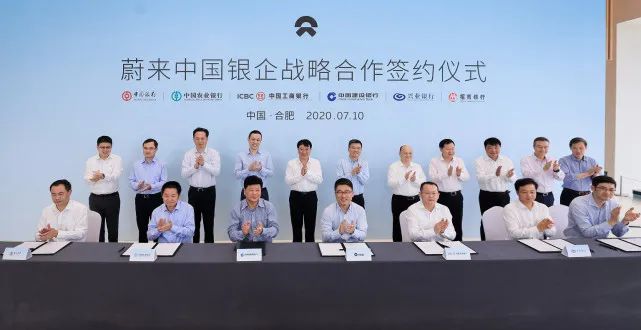 2020年7月10日上午,蔚来中国与中国建设银行安徽省分行等六家银行举行了蔚来中国银企战略合作签约仪式。根据战略协议,此次签约的六家银行将向蔚来中国提供104亿元人民币综合授信,以支持蔚来中国业务的运营与发展。本次与蔚来中国签署战略合作协议的包括:中国建设银行安徽省分行、中国工商银行安徽省分行、中国银行安徽省分行、中国农业银行安徽省分行、兴业银行合肥分行和招商银行合肥分行。蔚来中国将与各银行在企业账户体系搭建、供应链金融、汽车金融等业务领域展开广泛合作。