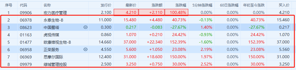 从上市首日表现来看,截至收盘,欧康维视生物涨幅152.39%,报37港元,每手赚11170港元(剔除手续费,下同),电子烟第一股思摩尔国际涨幅150%,报31港元,每手劲赚18600港元,永泰生物涨幅40.73%,报15.48港元,每手赚4480港元,虎视传媒涨幅24.42%,报1.07港元,每手赚525港元,正荣服务涨幅23.08%,报5.60港元,每手赚1050港元,绿城管理控股涨幅30%,报3.25港元,每手赚750港元,中国蜀塔却出现破发,跌幅27.67%,报0.217港元,每手亏损830港元。