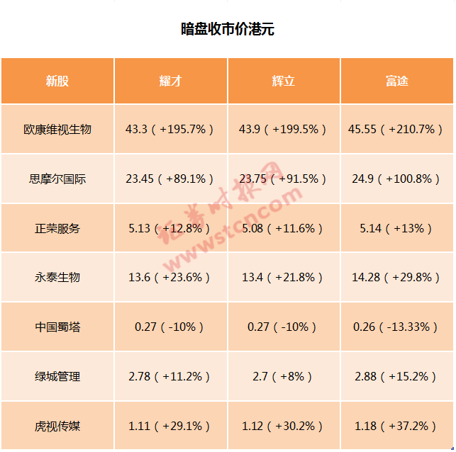 事实上,昨日的暗盘交易早已暗示了欧康维视生物等7只新股今日市场表现。证券时报记者统计了耀才、辉立、富途三大券商昨日暗盘收盘价,欧康维视生物富途暗盘较招股价14.66港元暴涨210.7%,收报45.55港元,不计手续费,一手(500股)赚15445港元。7只新股中,唯有中国蜀塔出现破发,此股也是今日表现最差个股。