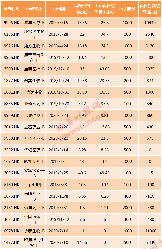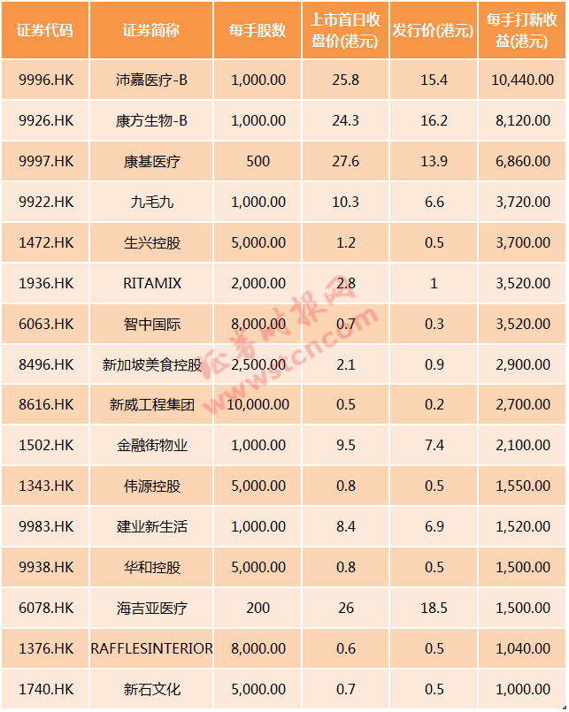 上市首日打新盈利超过1000港元的个股: