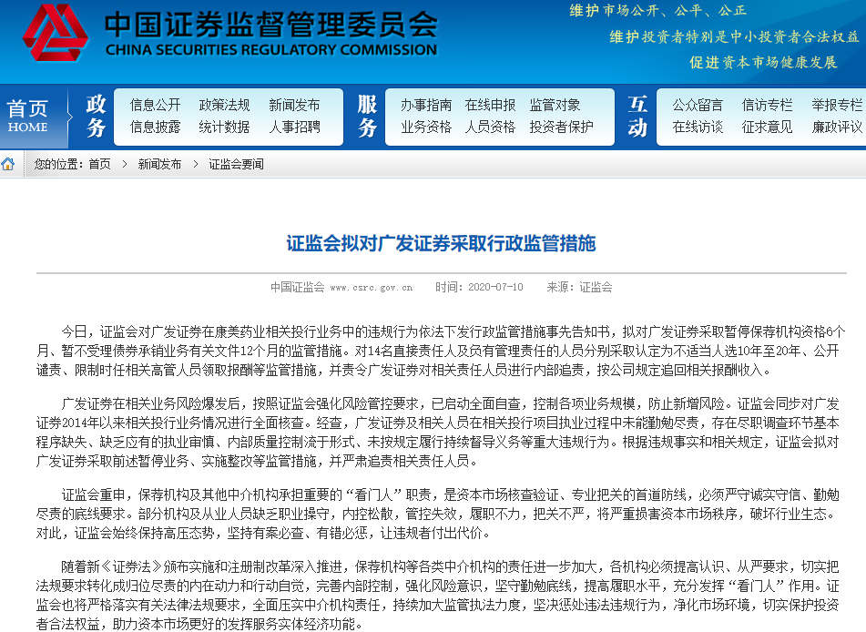 今日,证监会拟对广发证券采取暂停保荐机构资格6个月、暂不受理债券承销业务有关文件12个月的监管措施,同时,14名直接责任人及负有管理责任的人员分别采取认定为不适当人选10年至20年、公开谴责、限制时任相关高管人员领取报酬等监管措施,并责令广发证券对相关责任人员进行内部追责,按公司规定追回相关报酬收入。