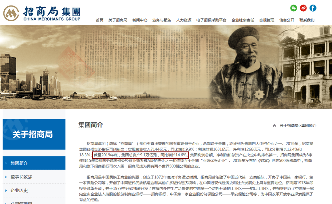 招商局集团官网显示,2019年,招商局集团各项经济指标再创新高:实现营业收入7144亿元,同比增长9.9%;利润总额1631亿元、净利润1266亿元,同比分别增长12.4%和18.3%;截至2019年底,集团总资产9.1万亿元,同比增长14.6%。集团利润总额、净利润和总资产在央企中均排名第一。