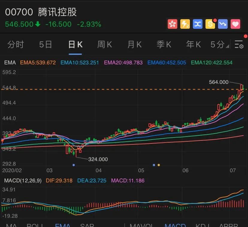 而高管的减持并未对腾讯的股价产生较大影响。近期,在高管的轮番减持下,腾讯股价依然突飞猛进。