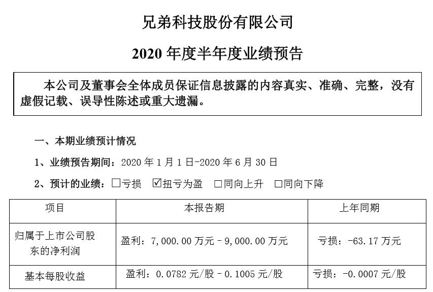 7月8日晚,兄弟科技发布2020年上半年露业绩预告,公司2020年度半年度净利润为盈利7000万元–9000万元,公司上年同期净利润为亏损63.17万元,同比变动11181.21%至14347.27%。