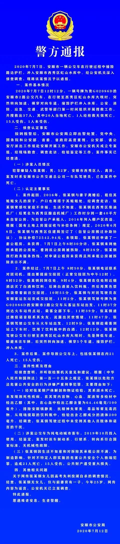 2020年7月7日中午12时许,安顺市一辆公交车在行驶过程中撞坏湖边护栏,坠入安顺市西秀区虹山水库中。事件发生后,公安部、应急管理部等国家有关部门及省、市迅速组成调查组开展缜密调查,现将有关情况通报如下: