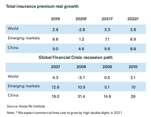全球经济萎缩4%将导致保险需求大幅下降,不过,瑞再预计,保险行业将安然渡过这场为期可能短暂的衰退。随着经济步入更持久的复苏,保费增长率将回升。