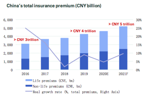 中国保费收入有望于2020年第二季度快速反弹,2020年实际增长率将达到5%,2021年为10%。到2021年,中国总保费规模预计将超过5万亿元人民币(7430亿美元)。