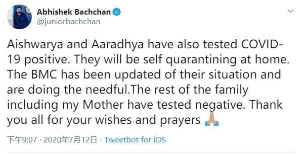 阿比谢克在12日的推文中表示,“艾西瓦娅和阿拉迪娅的新冠病毒检测也呈阳性,她们将在家进行自我隔离。已经告知了孟买市政府她们的情况,正在做必要的工作。包括我母亲在内的其他人检测结果都呈阴性,谢谢你们所有人的祝福和祈祷。”