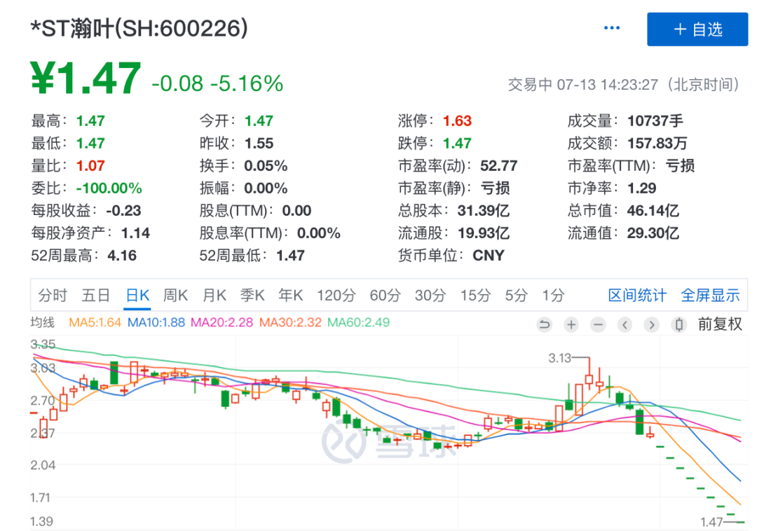 7月1日,瀚叶股份股票简称变更为*ST瀚叶,并直接被按在跌停板上。而该公司股价最高为2015年11月时期的6.73元(前复权),对应市值高达211亿元。如今,9个跌停之后,其最新市值仅剩下46亿元。
