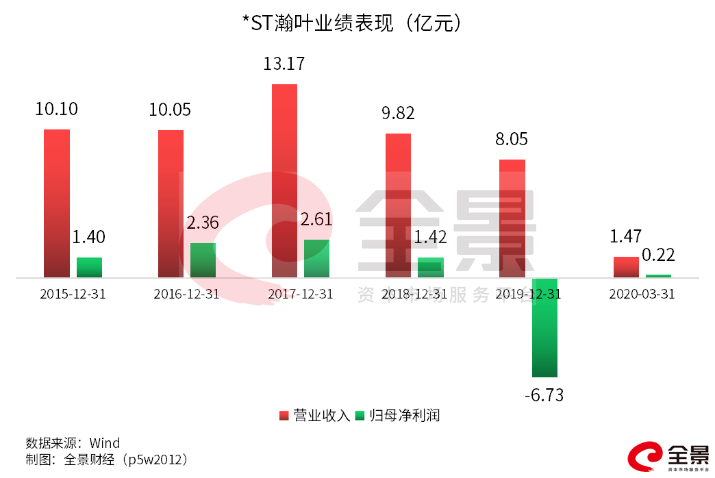 财报显示,2019年瀚叶股份实现营收8.05亿元,同比减少18%;净利润由盈转亏至6.73亿元。2020年一季度业绩再度下滑73.69%至2185.6万元。