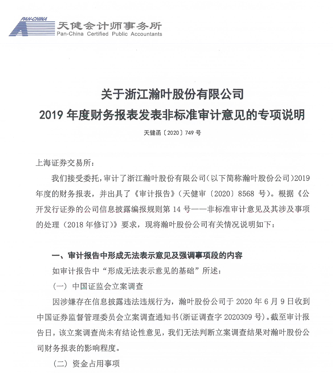对于这份好不容易披露的年报,随后审计机构就出具了无法表示意见的审计报告。7月1日起,瀚叶股份就被上交所实施了退市风险警示,并被调出融资融券标的证券名单。
