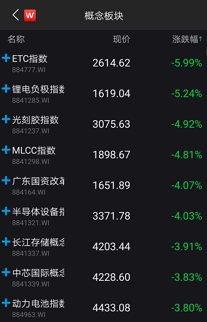 从盘面上看,光刻胶、长江存储、半导体设备、中芯国际概念指数等一众芯片股集体下跌。