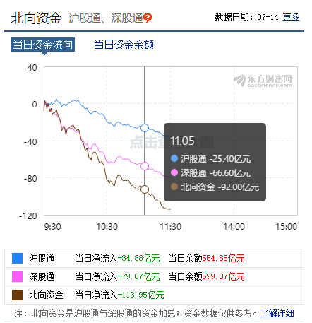 就在前一交易日,刚刚扫货的北上资金,今日则出现了猛烈的切换动作。7月14日上午,北上资金抛压猛烈,短短半日,净流出超113亿元。