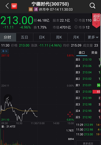 其中新能车龙头股宁德时代更是开盘大跌,盘中跌幅超5%以上。截至午盘报213元,跌超4.9%,半日市值蒸发超242亿。