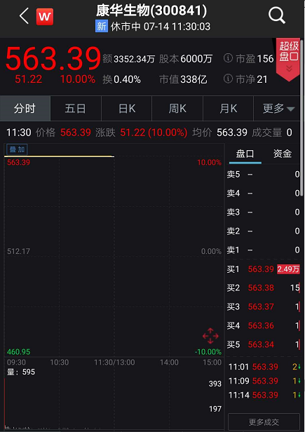 7月14日早盘,新股康华生物继续涨停,连续19日涨停,股价突破563元,中一签盈利超24万元。康华生物发行价70.37元。