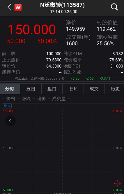 此外,可转债市场行情同样涨势凶猛。7月14日上午,“N泛微转”涨50%,盘中临时停牌。