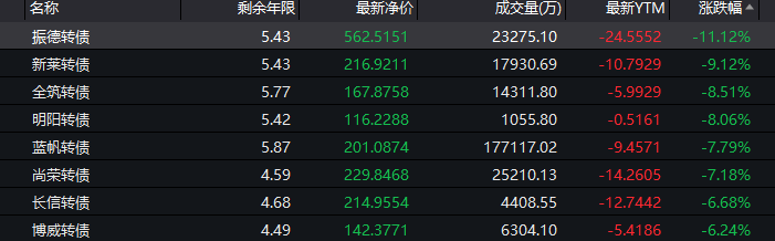 受调整影响,当天上午,逾七成转债下跌,振德转债领跌逾11%,新莱转债跌逾9%,全筑转债和明阳转债均跌超8%。