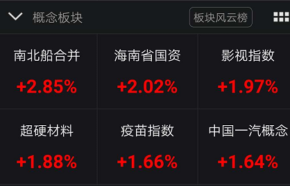 从当天上午盘面情况看,南北船合并、影视指数等概念题材领涨两市,同时军工股、航母股等低估值蓝筹也出现明显异动迹象。