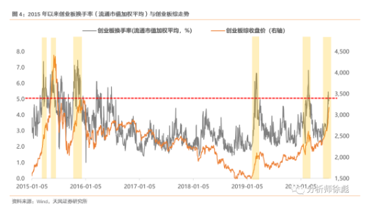 天风证券策略分析师徐彪表示,当创业板换手率(流通市值)超过5%,其后持续时间在10-30天不等,涨幅在7%-40%不等。换手率超过5%意味着泡沫化趋势的形成,在没有外力打断的情况下,大概率还会持续一段时间。