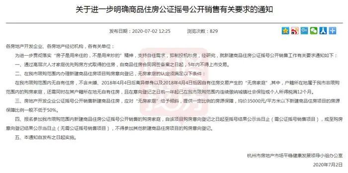 7月2日,杭州市升级了摇号政策,对高层次人才购房实施5年限售,同时严格了“无房家庭”的认定条件,进一步加大新房摇号公开销售对“无房家庭”的倾斜力度,并对购房意向登记的有关要求进行了调整。