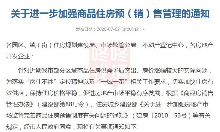 7月6日,宁波市政府新闻办公室微信公众号“宁波发布”披露,宁波市资规、住建、人民银行、银保监四部门联合印发《关于进一步保持和促进我市房地产市场平稳健康发展的通知》,从保持土地市场平稳、调整限购区域范围、强化金融政策监管、保障自住住房需求以及强化市场销售管理等五方面提出“十条”新政。该政策从7月7日起实施。