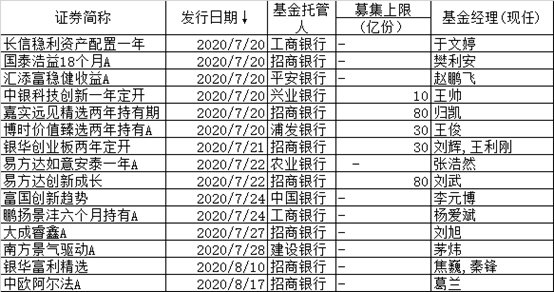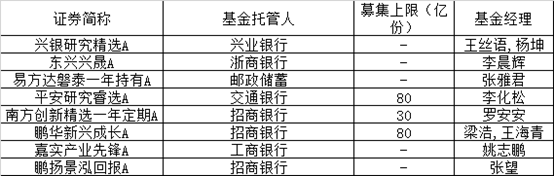 下周值得关注的有嘉实基金归凯管理的嘉实远见精选两年持有期、博时王俊管理的博时价值臻选两年持有、富国李元博管理的富国创新趋势、银华焦巍管理的银华富利精选,以及鹏扬基金总经理杨爱斌亲自管理的鹏扬景沣六个月持有、刘旭的大成睿鑫、茅炜的南方景气驱动、葛兰的中欧阿尔法。其中不少产品有规模上限,有些产品是封闭式产品,投资者关注时需要注意和自己资金使用周期相适应。