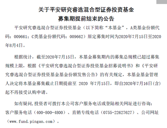 平安基金也快速的发布了相关公告,宣布提前结束募集。公告显示,平安研究睿选混合基金原本募集期为7月15日至8月4日,而截至7月15日,该基金募集总规模已超过募集规模上限,因此将该基金募集截止日提前至7月15日,7月16日(含)起不再接受认购申请。