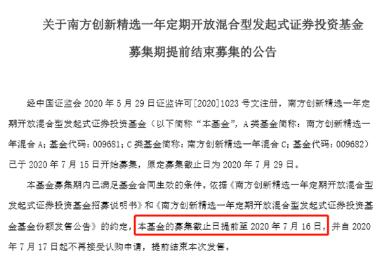 本周一南方核心成长混合基金引来386亿资金追捧,而其基金经理罗安安在7月15日又有一款新基金发行,为南方创新精选一年定期,该基金是可以投资新三板精选层的基金,限购30亿。而南方基金今日也发布公告称提前结束募集,提前结束至7月16日。