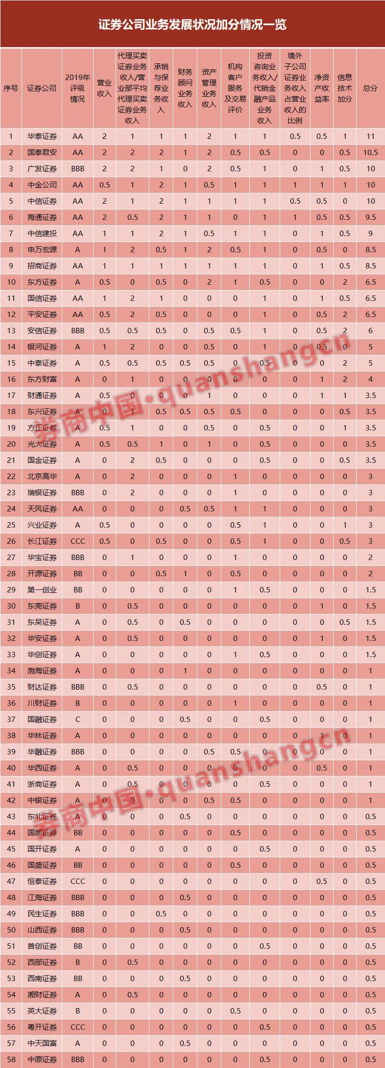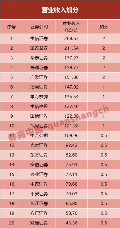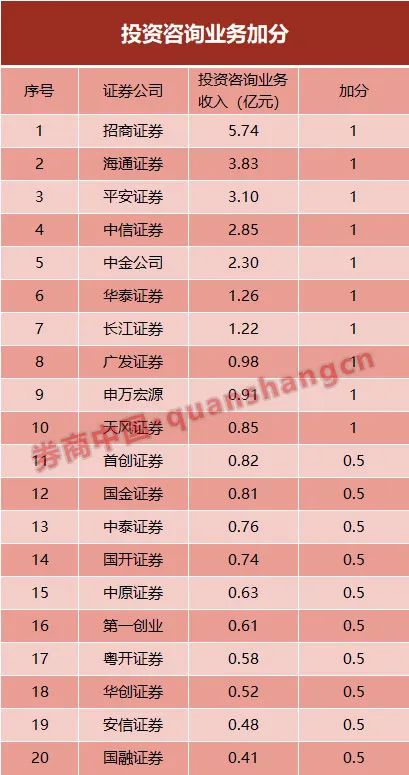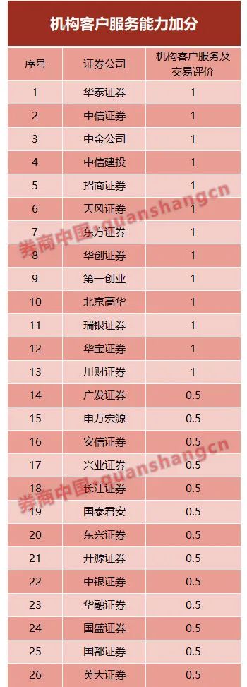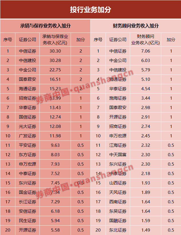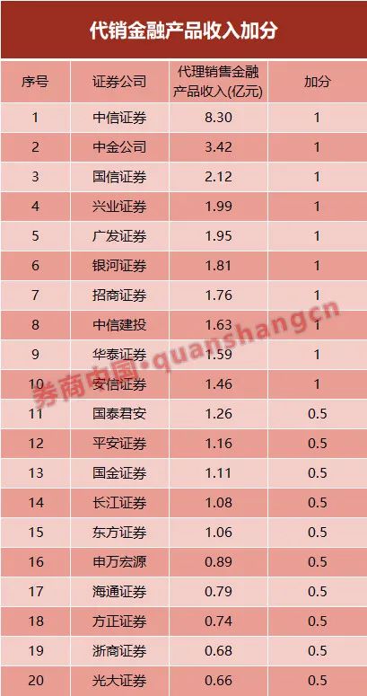 华泰证券、中信证券、中金公司、中信建投等9家券商该项指标可加1分,海通证券、安信证券、中泰证券等12家券商该指标可加0.5分。