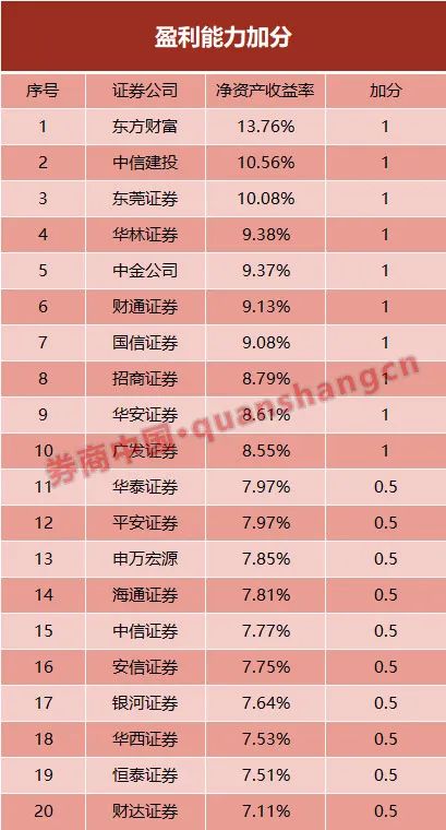 不难看出,在盈利能力加分一项,净利润绝对值并不占优势的东方财富证券、东莞证券、华林证券、财通证券等中型券商均跻身前列。而中信证券、海通证券、华泰证券等头部券商仅获得0.5分的加成,国泰君安、中泰证券、光大证券等公司甚至可能无法获得加分。