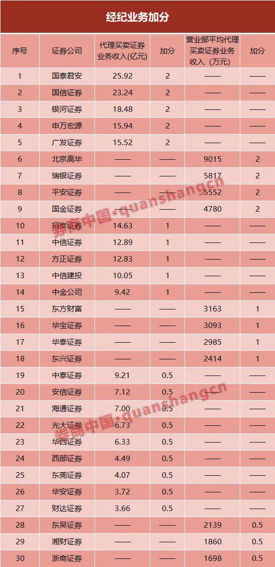 具体而言,此次共有30家券商可获加分,其中有9家可获加2分,其中国泰君安、银河证券、申万宏源、广发证券代买卖证券业务收入排名前五,北京高华、瑞银证券、平安证券、国金证券营业部平均代买卖业务收入排名前五,国信证券这两个指标均排名前五。