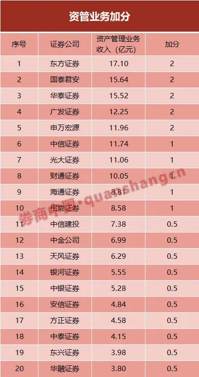 和往年一样,资管收入排名前20名的券商可获加分,这一指标并未发生变化。具体来看,东方证券、国泰君安、华泰证券、广发证券、申万可获加2分,中信、光大、财通、海通、招商获加1分。