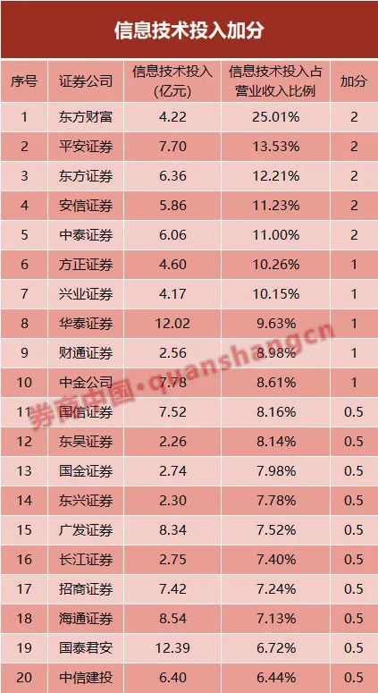 在信息技术考核中,共有20家券商可获加分。较2019年评级考核的三项细分指标不同,今年为“信息技术投入”、“信息技术投入占营业收入的比例”,多家中小券商可获加分。