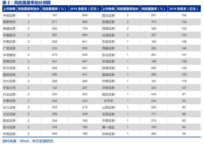 申万宏源研究报告指出,分类评价结果是券商竞争力及合规能力的综合体现,商业模式领先、具有专业服务能力的头部券商加分更多。在该研究所对上市券商的测算中,预判中信证券、华泰证券、国泰君安、中金公司、中信建投、招商证券、海通证券等8家券商将在2020年分类评级中获得AA,从而影响创新业务资格获取。