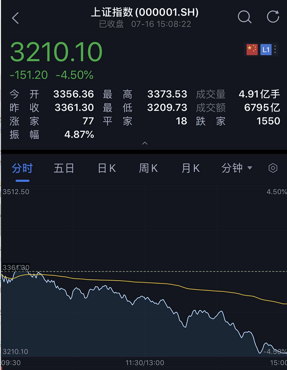 7月15日,两市股指小幅低开,早盘小幅拉升后,在白酒、医药等板块的拖累下震荡下行,午后白酒股暴跌,券商股亦大幅跳水,三大股指开启暴跌模式,沪指盘中跌幅超4%,创业板指跌幅一度超6%。
