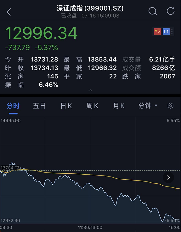 截至收盘,沪指跌4.5%报3210.1点,深成指跌5.37%报12996.34点,创业板指跌5.93%报2646.26点。