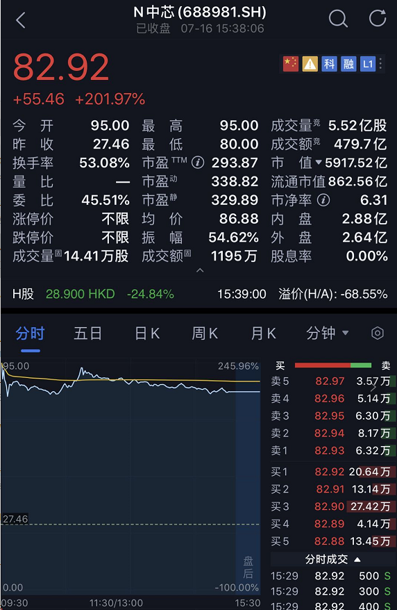 中芯国际A股全天成交480亿元