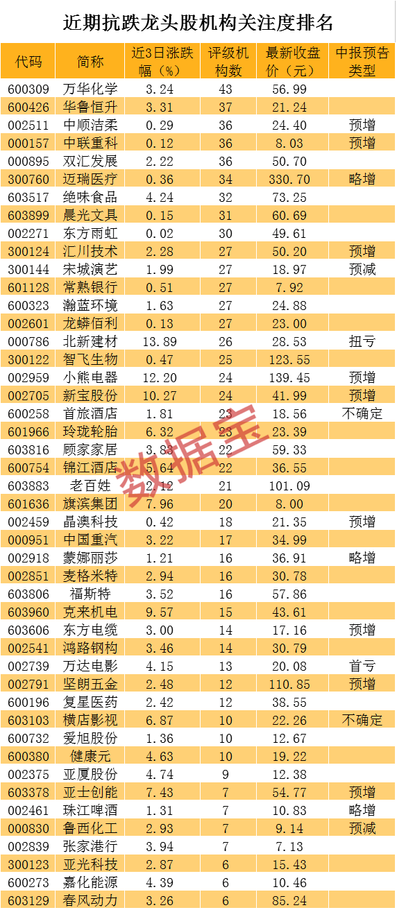 证券时报·数据宝统计显示,最新市值百亿元以上且评级机构家数在5家以上的个股中,有46只个股近3个交易日逆市上涨。包括了4只千亿市值股票,迈瑞医疗、智飞生物、万华化学、双汇发展等,以及复星医药、汇川技术、东方雨虹、中联重科、晨光文具等市值超过500亿元的个股。