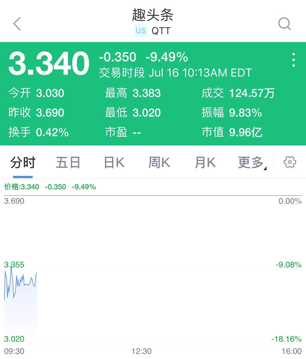 趣头条号称“看新闻能赚钱”,主要收入是广告。趣头条app于2016年6月上线,2018年8月18日提交美国IPO申请,这个速度打破了当时中国企业在纳斯达克的最快上市纪录。2018年9月,趣头条在美国纳斯达克上市。今日交易时段中,趣头条股价直线跳水,最高跌近20%,截至记者发稿,跌幅为9.49%。